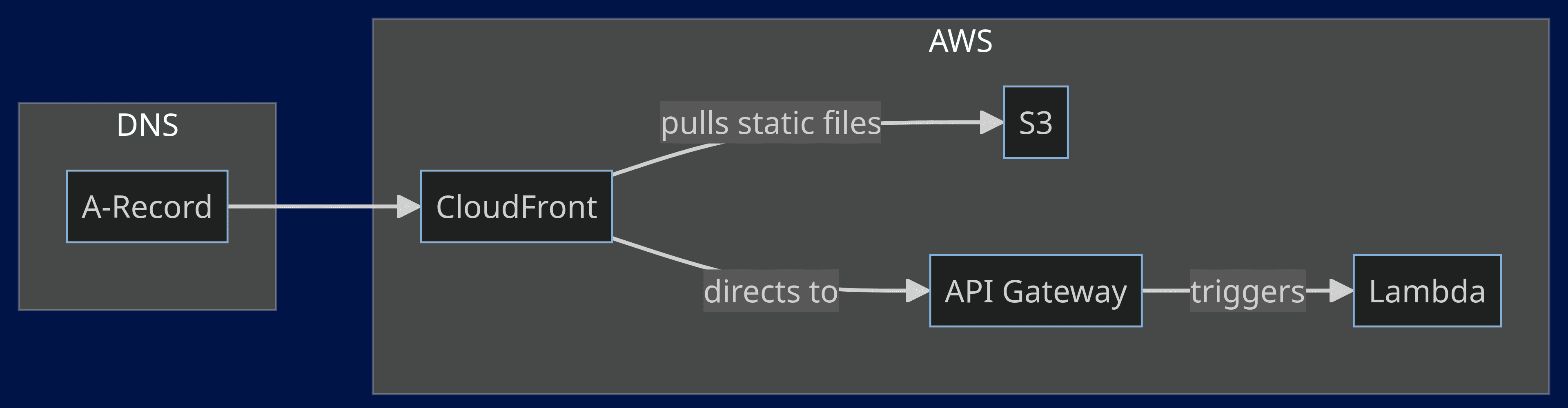 The DNS was configured to direct to CloudFront, which either delivered static files or connected to the API Gateway, triggering our Docker-contained lambdas.